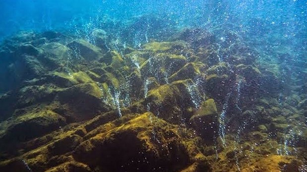 Pada kedalaman enam meter, pengunjung menemui terumbu karang mengeluarkan gelembung-gelembung Udara yang merupakan gas yang keluar dari perut Gunung Banua Wuhu. (Foto:globalberita.com)